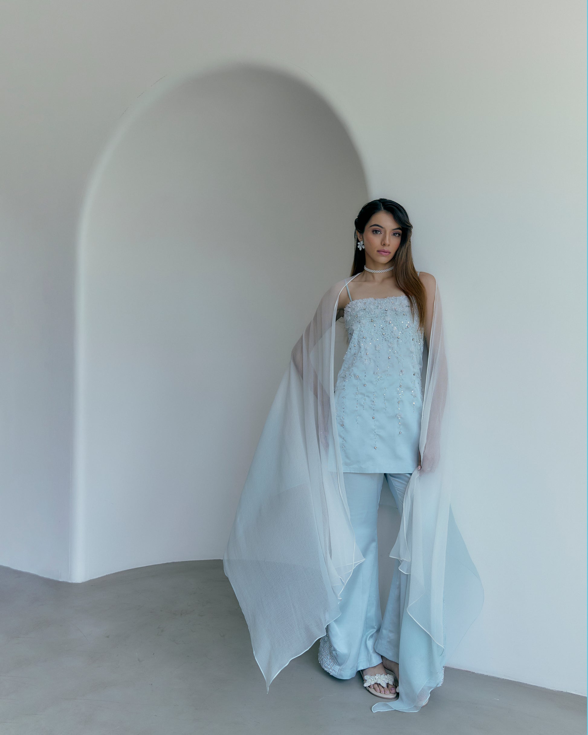 Dive into ethereal elegance with The Icy Mist Set, a serene three-piece ensemble inspired by glacial blues and ocean light. The straight-fit pants feature delicate hand embroidery with pearl and bead detailing, blooming into soft 3D floral accents. Paired with an airy ombre-dyed dupatta, this look flows like a sea breeze — light, graceful, and unforgettable.