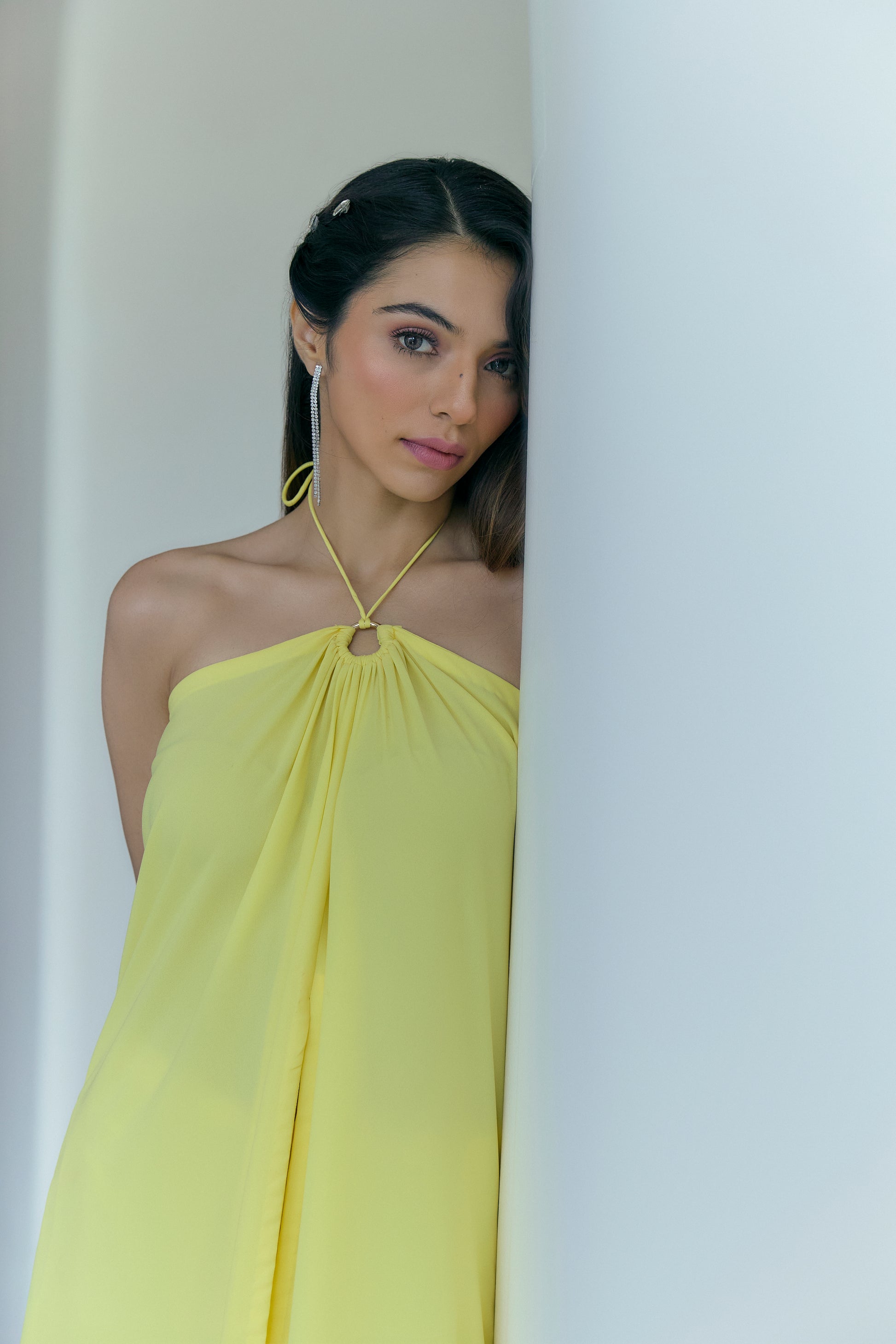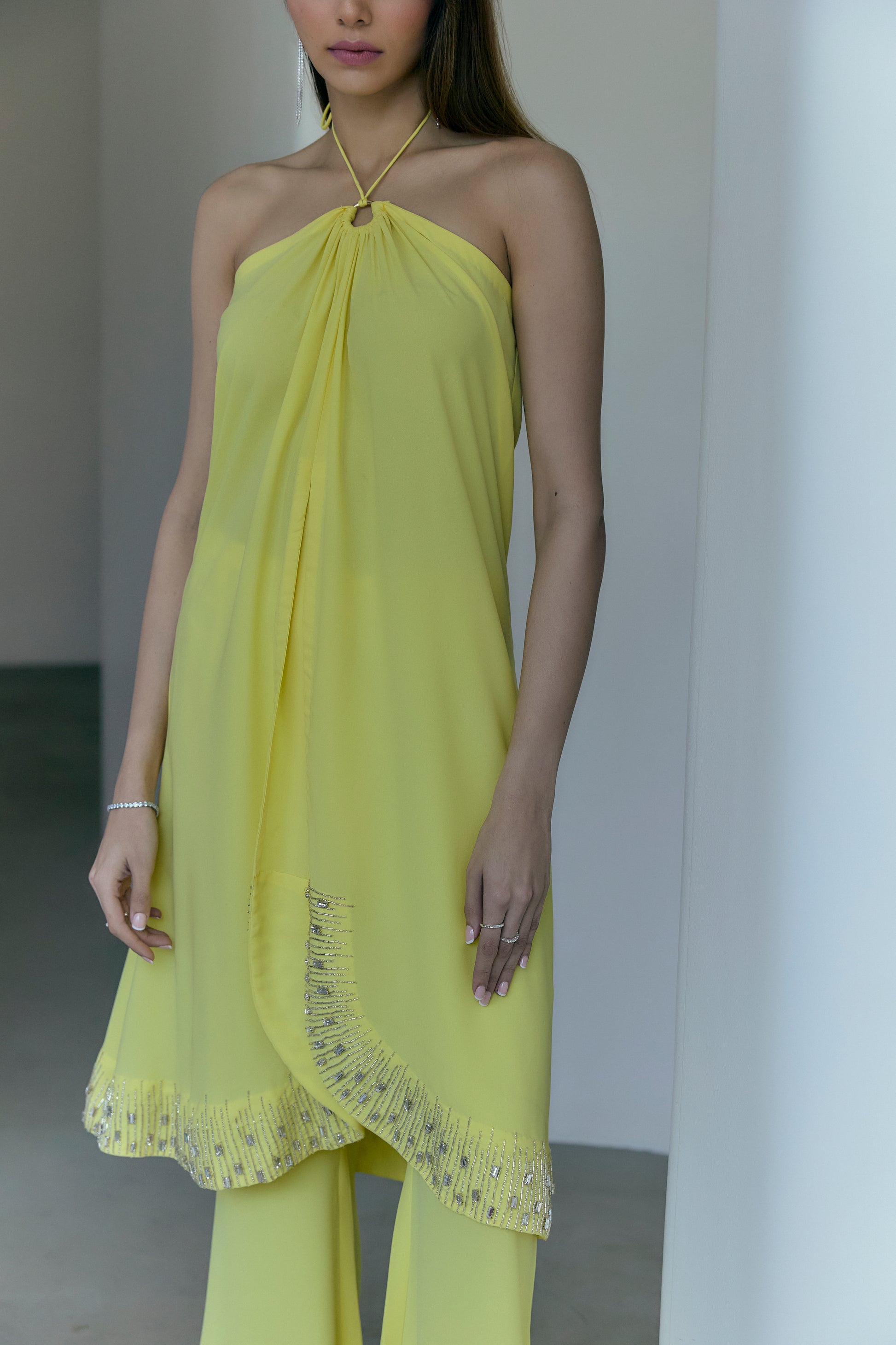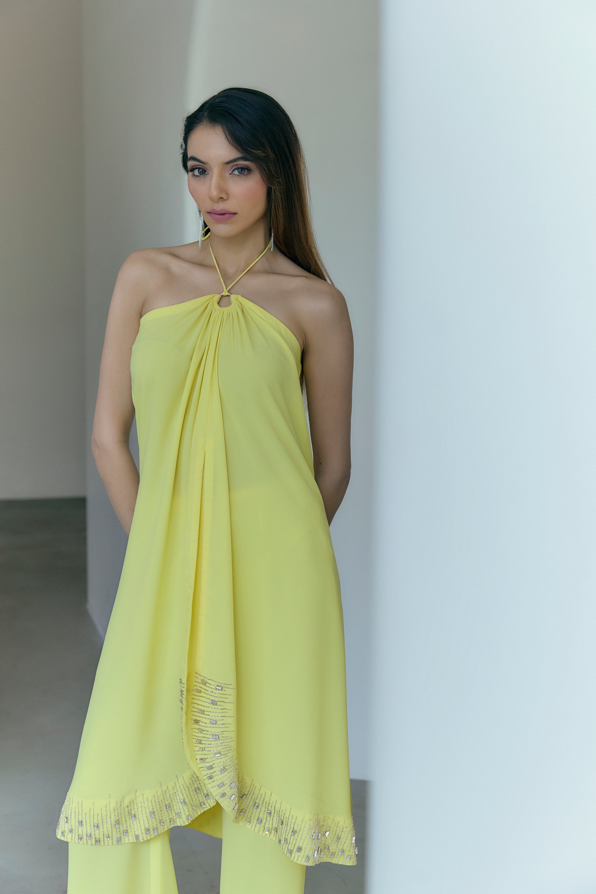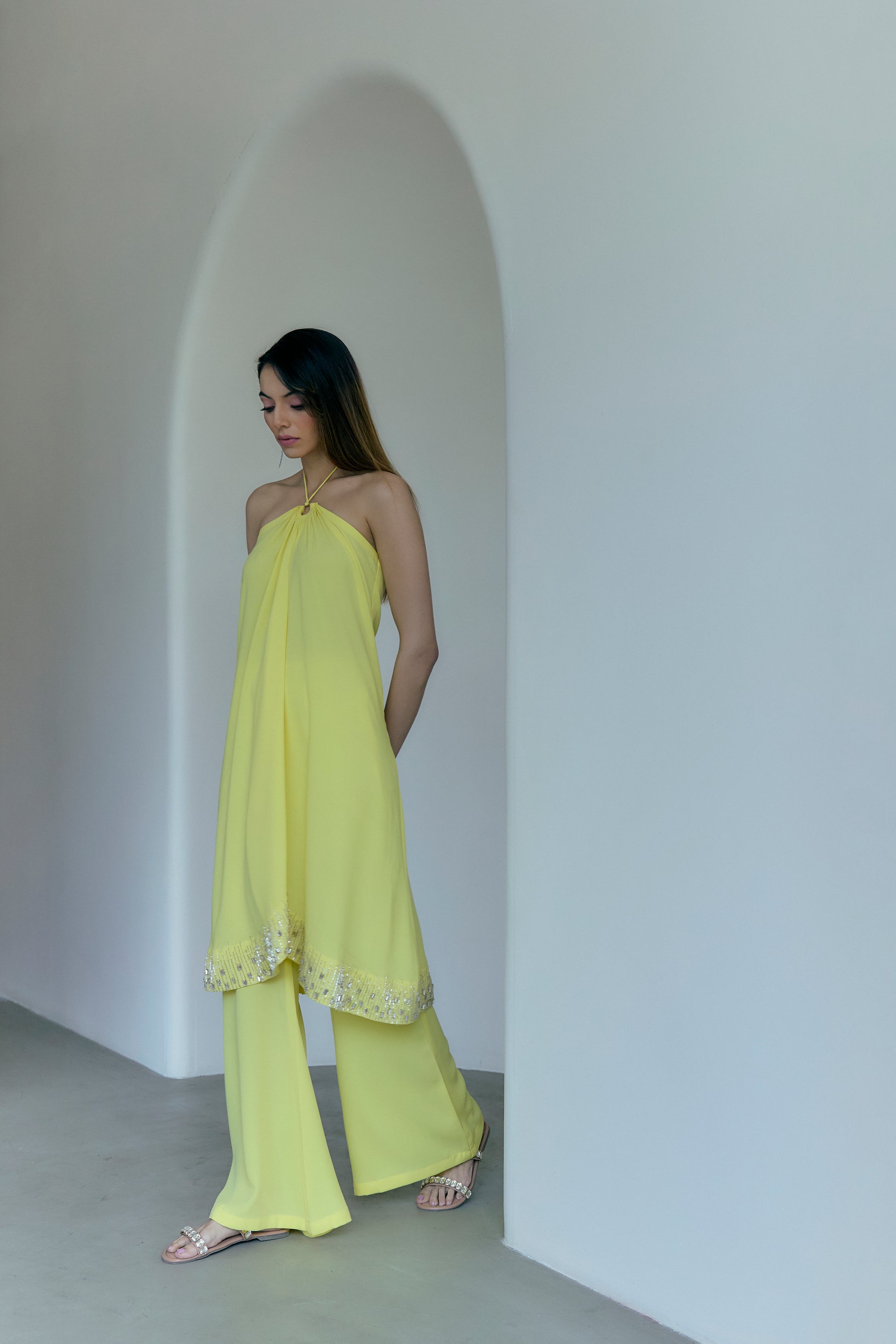 The Sol Set is crafted in a soft, sunshine-hued crepe that drapes fluidly over the body. The halter-style tunic features a statement ring detail and a hand-embellished asymmetric hem—adding just the right hint of shimmer.